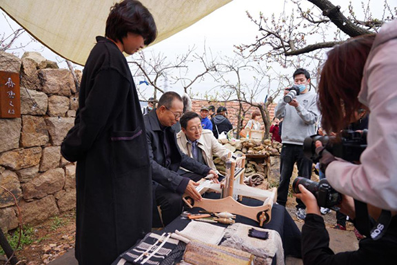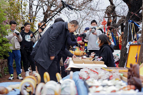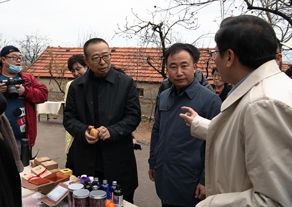 潘魯生在靈山衛(wèi)街道調(diào)研鄉(xiāng)村文化旅游和文創(chuàng)市集,與參加鄉(xiāng)村美學主題分享會的文化愛好者進行交流。調(diào)研過程中,正逢當?shù)卮遴l(xiāng)村文化創(chuàng)意“杏運市集”開集,潘魯生對在一個小山村里看到鄉(xiāng)土氣息與時尚藝術元素完美融合的鄉(xiāng)村文創(chuàng)市集表示贊賞。潘魯生指出,發(fā)展鄉(xiāng)村旅游,不只是打造旅游景點,而是在保護和建設好鄉(xiāng)村自然與文化生態(tài)的基礎上,活化鄉(xiāng)村文化資源,凸顯鄉(xiāng)村特色和吸引力,為高速發(fā)展的現(xiàn)代化城市保留一處“鄉(xiāng)愁”,讓更多的人感受鄉(xiāng)愁的深度和鄉(xiāng)土的溫度。