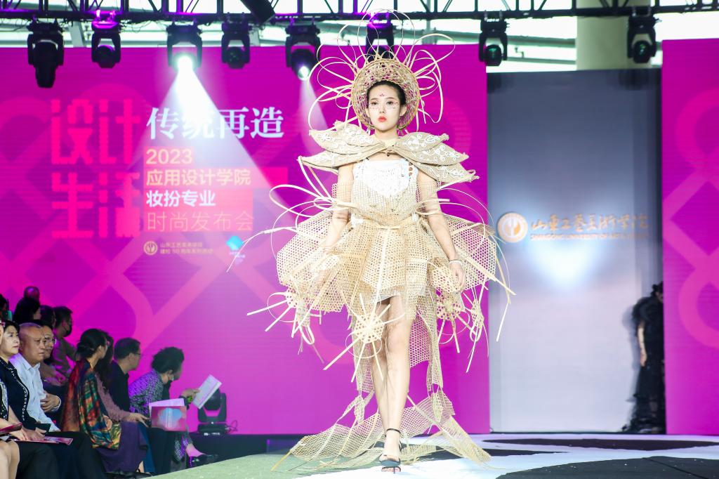 時尚發布會是山東工藝美術學院2023屆藝術博覽會動態展的部分,由山東工藝美術學院研究生處、服裝學院、現代手工藝術學院、應用設計學院共同打造,包括服裝設計展演(70套)、首飾設計展演(58套)、妝扮設計展演(16套)三個部分。這是一場傳統與時尚碰撞的藝術盛宴,也是一次守正與創新交融的匠心手造之旅。年輕的設計師們在一針一線、一絲一縷中探索未來,闡述時尚文化的潮流更迭,彰顯穿越時代的青春與力量,讓創新設計賦能美好生活。參加展演的模特曾多次參加國內外各種專業賽事并屢獲獎項,聚光燈下,他們盡情展現服裝設計、首飾設計與妝扮設計的魅力,用青春定義設計作品的內涵。
