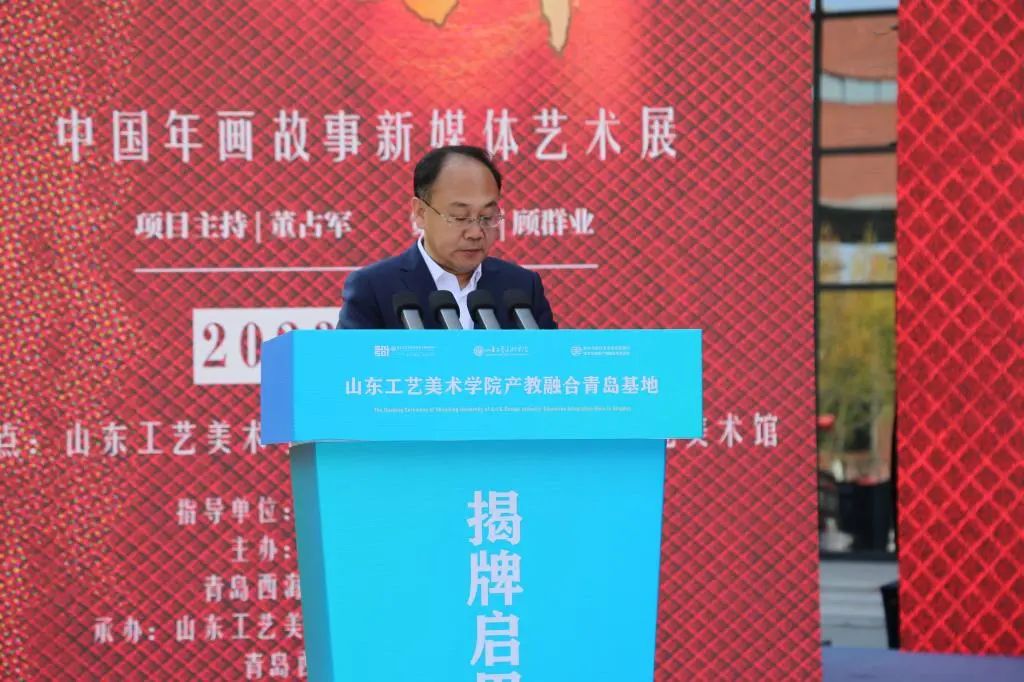10月11日,由國家藝術基金管理中心指導,山東工藝美術學院和青島西海岸新區(qū)文化和旅游局聯(lián)合主辦的2023年度傳播交流推廣項目《承古萌新——中國年畫新媒體藝術展》首場展覽在山東工藝美術學院產(chǎn)教融合青島基地開幕。院長董占軍出席開幕式。
