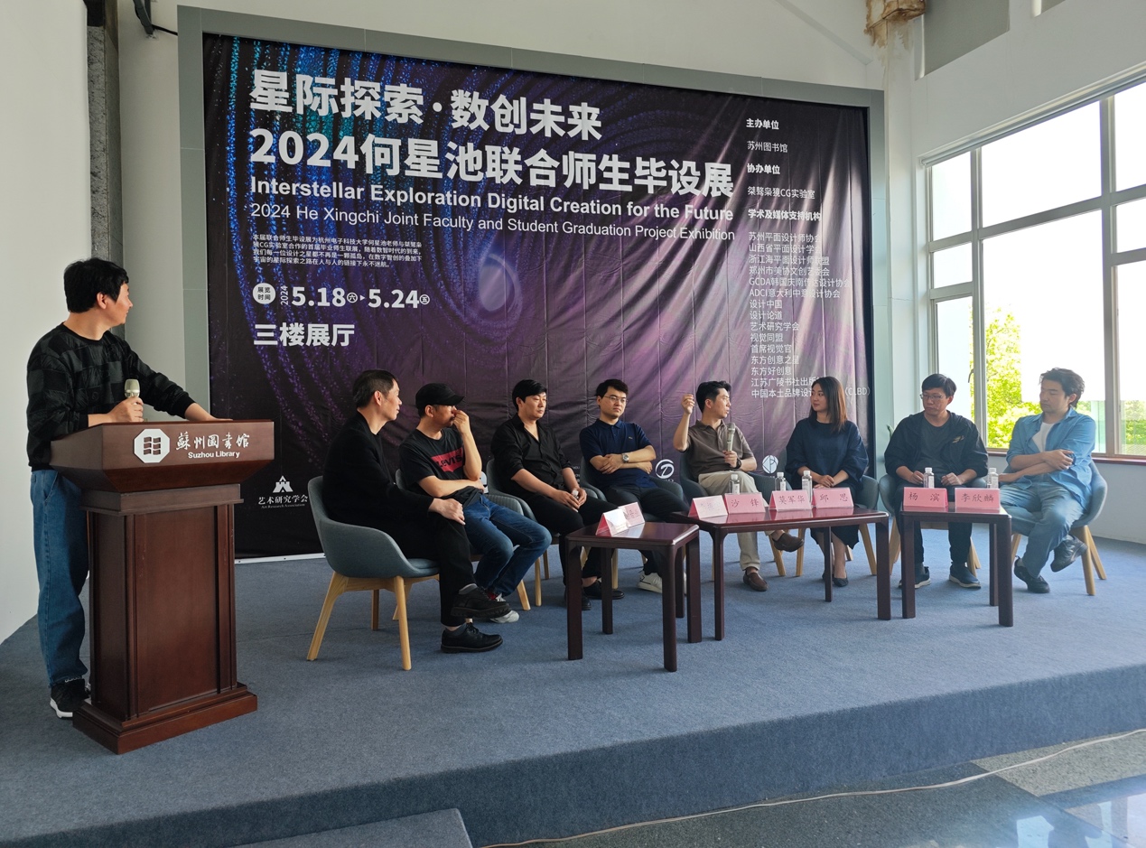 如夢江南的蘇州城,一場充滿創意與想象的展覽在蘇州圖書館正式拉開帷幕。由蘇州圖書館主辦的“2024星際探索·數創未來何星池聯合師生畢設展”于近日盛大開幕,5月18日-24日為期一周共展出了何星池老師弟子與桀驁梟獍CG實驗室共創的畢業設計作品80余件。展覽首日上午10點舉辦了開幕儀式并召開了“星際探索·數創未來”微論壇,與會嘉賓有蘇州科技大學藝術學院院長、教授,中國實學研究會社會美育專委會委員,蘇州美術家協會藝術設計專委會主任莫軍華;江南大學設計學院副教授李振宇;江南大學設計學院副教授楊濱;蘇州工藝美院視覺傳達學院副教授謝晉業;浙江機電職業技術學院教師武凡;蘇州大學數字媒體藝術系教師李欣麟;杭州電子科技大學特聘副教授何星池;蘇州如視設計有限公司創始人沙鋒;桀驁梟獍CG實驗室創始人邱思,桀驁梟獍CG實驗室成員曾新宇、楊俊。