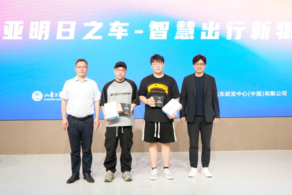 山東工藝美術(shù)學(xué)院教務(wù)處處長顧群業(yè)、工業(yè)設(shè)計學(xué)院書記王玉杰、工業(yè)設(shè)計學(xué)院副院長張公明,以及韓國現(xiàn)代汽車研發(fā)中心起亞造型部室長任承模、責(zé)任研究員李孝成、外飾造型設(shè)計組組長梁立升共同為獲獎同學(xué)頒發(fā)了證書及獎品。