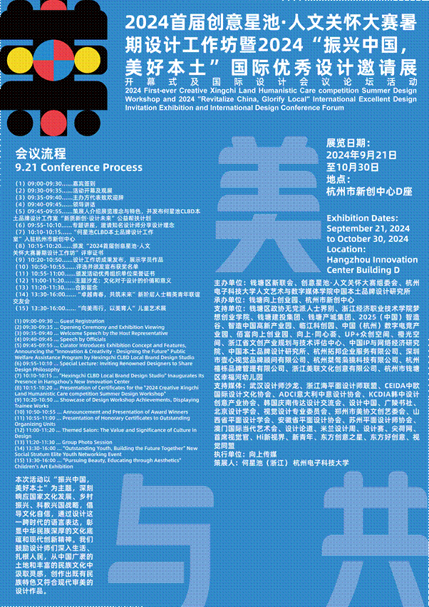 2024年9月21日,備受矚目的2024首屆創意星池·人文關懷大賽暑期設計工作坊暨2024“振興中國,美好本土”國際優秀設計邀請展在杭州錢塘區盛大開幕。此次活動匯聚了國內外眾多設計精英,順利開展了國際設計會議論壇,共同探討了設計的未來趨勢,并展示了一系列以文化創意與人文關懷為核心的設計作品。