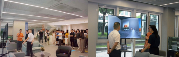 開幕之際,何老師引導蒞臨現場的領導、嘉賓及新階層人士舉行展覽巡視活動,介紹主要的展區及此次展覽實現的設計技術賦能文化創新領域的相關展現。