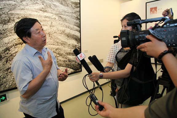 編者按:5月26日,《墨境——潘魯生當代藝術巡回展》在北京中國國家畫院美術館開幕。展覽以“墨境”為主題,展出潘魯生新近創作的瓷板水墨、魯班墨線、纖維藝術等作品70余件,體現了當代實驗藝術跨界表現與發展創新。這些由中國山水畫水墨意象所生發的抽象水墨表現,水墨、陶瓷、纖維等多種媒材渾融合一,呈現了當代語境下水墨精神的在媒介拓展后的發展面貌。中國美術家協會主席劉大為為潘魯生展覽題字“熔古鑄今,開拓創新”,并在參觀展覽后接受了媒體記者的采訪。以下為訪談實錄。