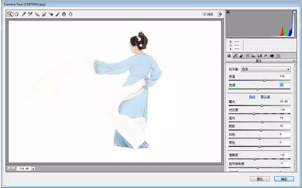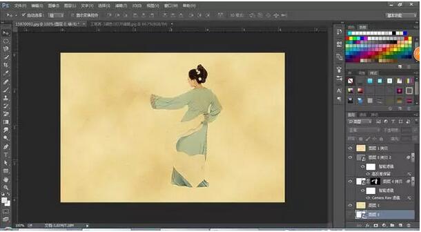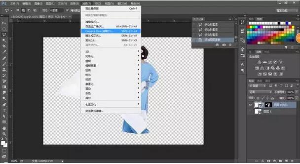 P個人感覺工筆畫偏淡雅素凈,原圖顏色偏亮,還需要對圖片進行處理。這里用到的是【濾鏡】選項里的Camera Raw濾鏡。