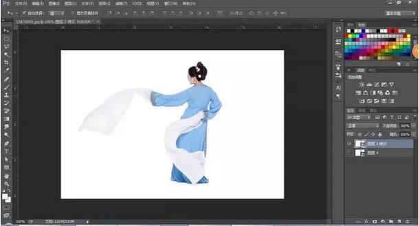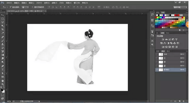 又到摳圖了,在有相近顏色的情況下,直接使用【快速選擇工具】可能會出現選中多余部分的情況,減選的過程中也會出現問題。那要怎么辦呢?可以試試利用通道摳圖喲!選中圖層0拷貝,進入通道面板,選擇合適的通道拖拽到下方的小頁簽上進行復制。這里重點觀察的是水袖與白色背景的差別,相比之下綠色通道稍微明顯,故復制了綠色通道。