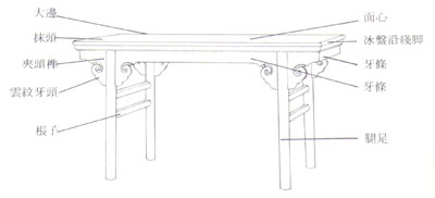 畫案的尺寸要大于半桌,與長條桌的區別就在于它的面較寬。畫梁與書案的區別在于前者不設抽屜而后者有抽屜。這種夾頭榫畫案是明式家具中畫案類的典型造型。