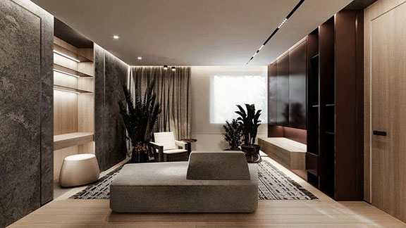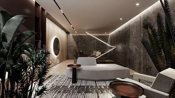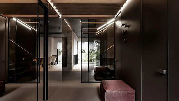 公區使用了大面積的黑色透明玻璃,為空間融入一絲現代感。鏡面與線型燈管的使用讓整個公共區開闊通透,讓人感到閑適無壓的生活節奏與都市氣息并存的生活體驗。