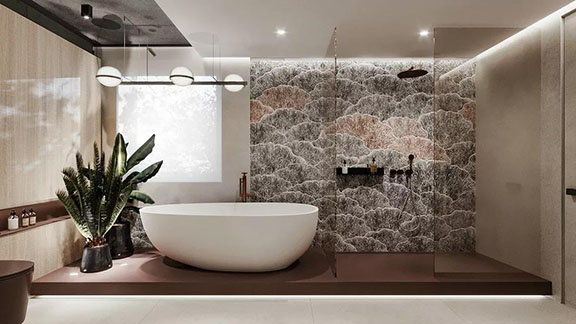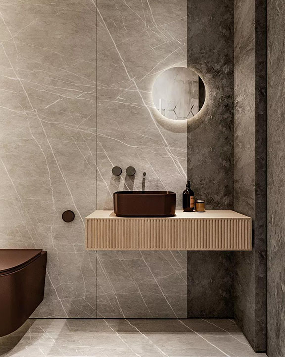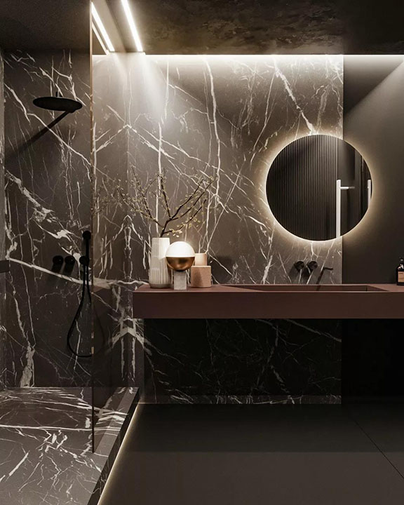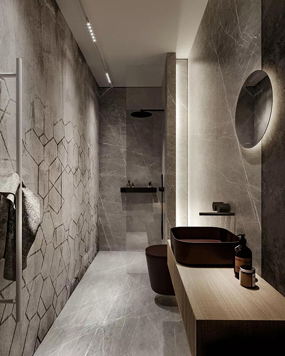 衛生間黑色的運用,把克制的情緒表現的淋漓盡致,少之不熟,多則“焦”。紅色的適量點綴使得的空間形與色的關系持續,和諧,完整,一種更純粹的設計和生活方式被喚醒。