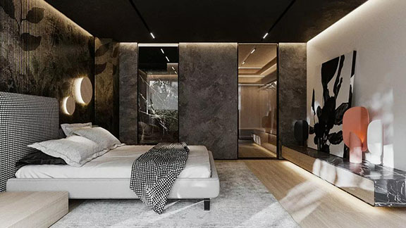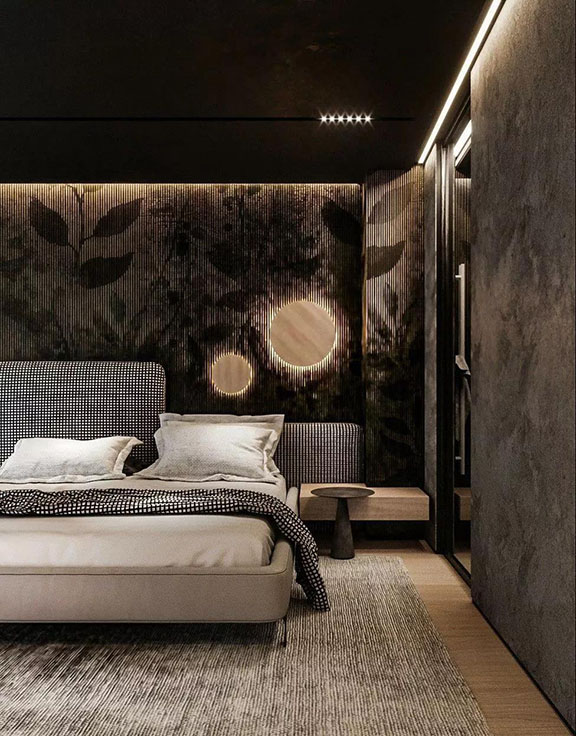 主臥空間中使用簡約內斂的高級黑作為主色調使人沉淀心靈, 淡淡的原木色系是貫穿空間的靈魂,配以舒適溫柔的床品,藝術壁紙的穿插、融合打破了空間的平淡乏味,每一處都彰顯著居住者優雅的生活狀態與情調。