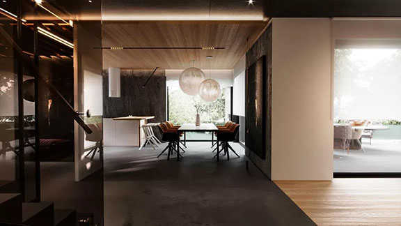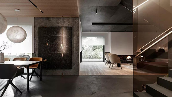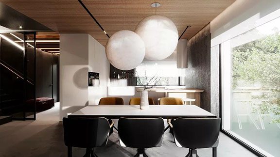 客餐廳空間基調為中性灰色,餐廳兩個皓月般的圓形吊燈 是對極簡設計的一種溫柔回應。它復古溫婉,盡顯極簡主義,呈現出簡約、休閑的都市格調。