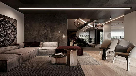 為了保持簡練潔凈的質感,客廳利用柔光筒燈與一根簡潔的燈管為照明帶來更多層次,也中和了黑色天花板帶來的冰冷,讓每一束光為家帶來別樣氣質。