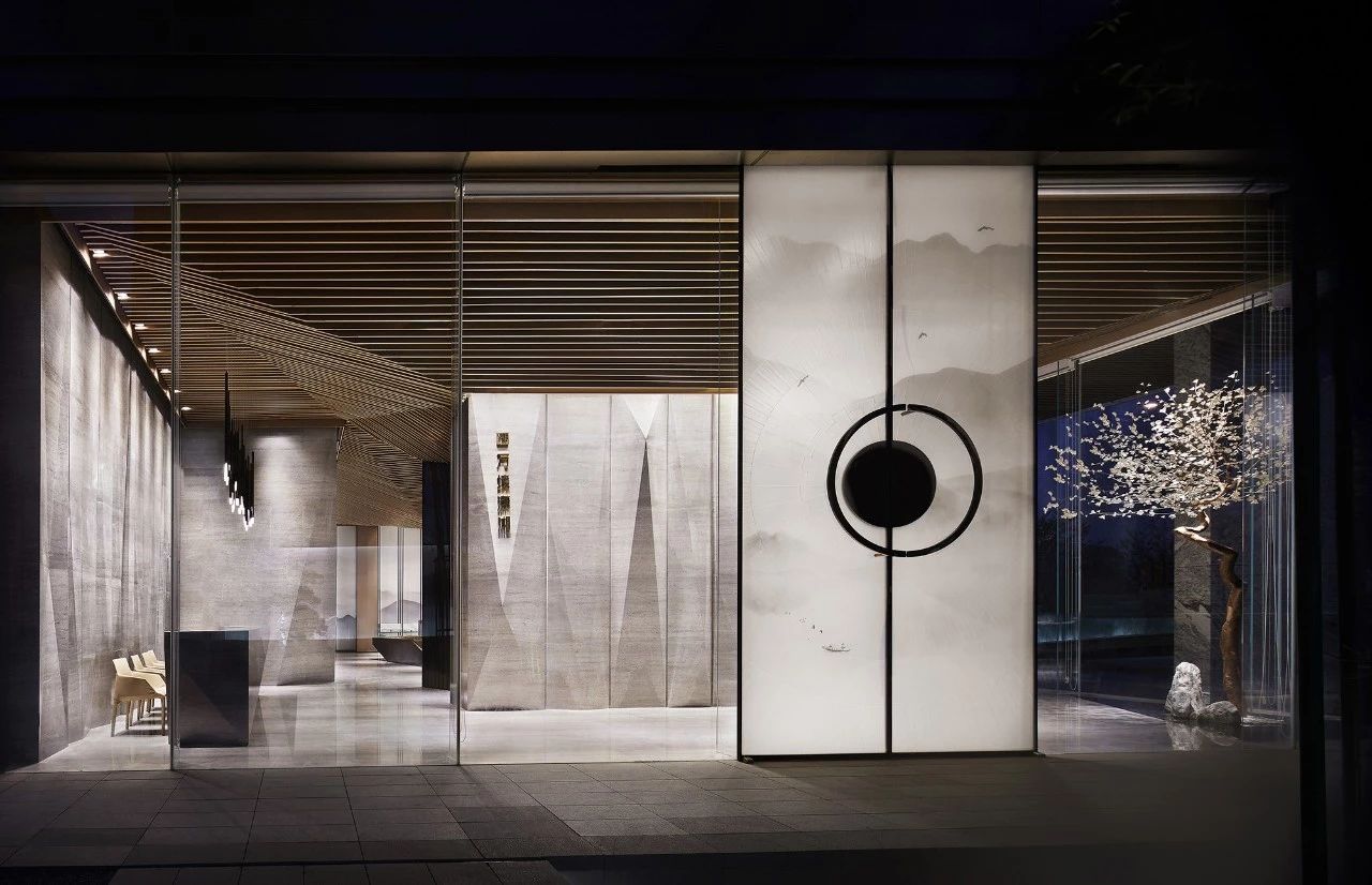 庭者,堂前階也;院者,周坦也。建山水,植松竹,依軸為序歸置山水動線。長幅潑墨山水畫卷圍合起建筑與堂前朗闊之地,山石水景各有逸趣,又富于形、歸于道,重置當代語境下的東方文化認同感。云紋墻面上雕鏤的半透屏風圓融雅正,以金屬穿孔板為材,在漏景中定格流云紋樣,勾勒出輕靈入勝的美學意涵。