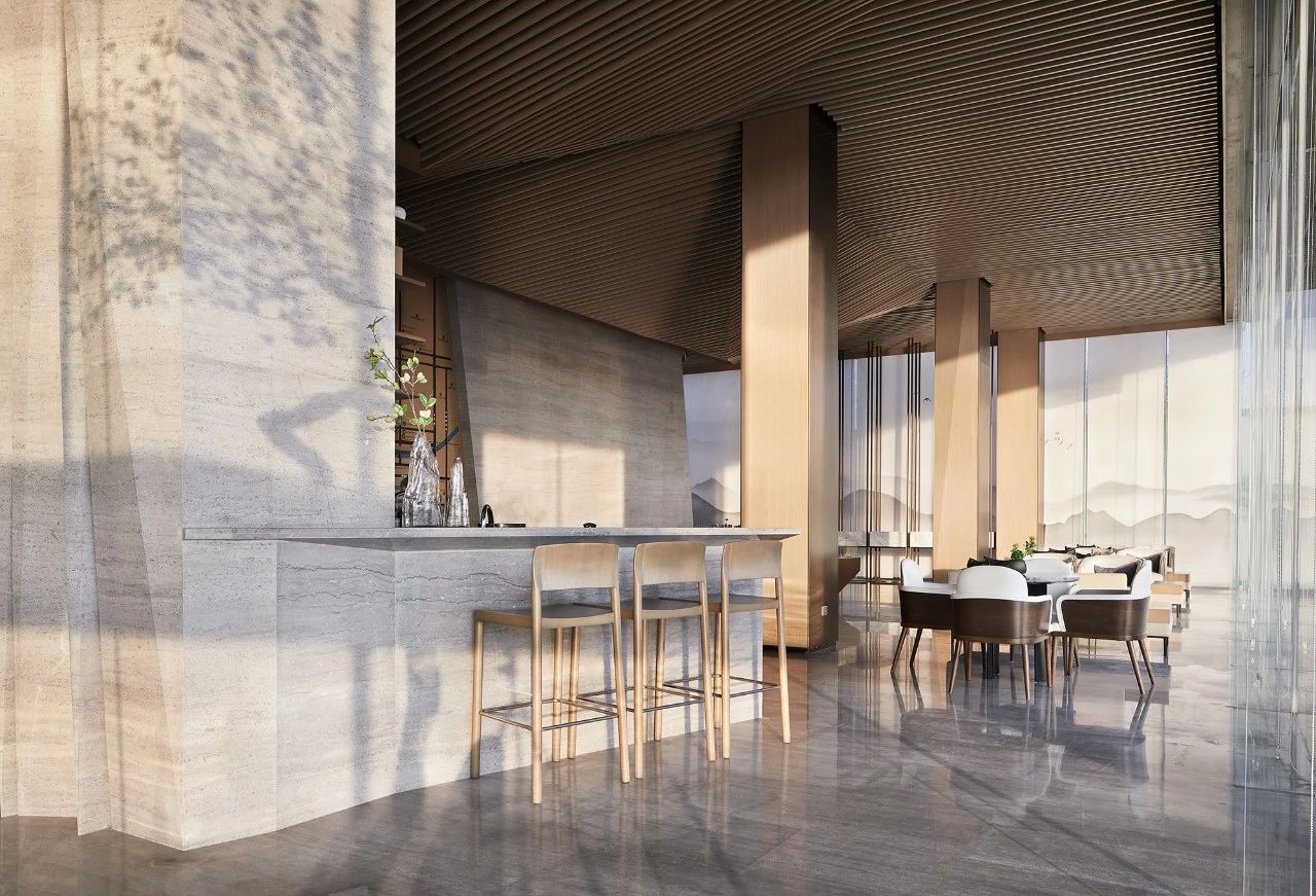 木藝天花的不規則層次,恰似山巒的連綿起伏狀,又如玲瓏精致的霧凇切割面,設計的寓意游走在虛實之間,于東方情致的隱喻中,并置為空間格調的韻腳,立意高遠,詩性曠達。一株梨樹立于山石端景上,遠觀有霧凇般的清透玉質,滿目玉樹瓊枝,凝住“梨花千樹雪”的高意雅境。大面積的玻璃軒窗,搭配水墨疊峰的卷簾,一開一闔間,意境互換,室內外的自然與人文相融共生。