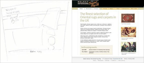 從零開始做網站是一個非常有名的網站,提供建站方面的實用性建議。在網站設計全攻略實用指導 這篇文章中,對于用鉛筆畫草圖,作者如是說:“草圖能夠快速的將我腦子里的想法描繪下來,不容易忘記,并快速用Photoshop繼續創作。這種方法比直接用Photoshop創作高效的多。”如下圖,左邊是是草圖,右邊是最終設計,繪畫功底依然不是必要的。