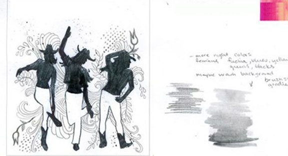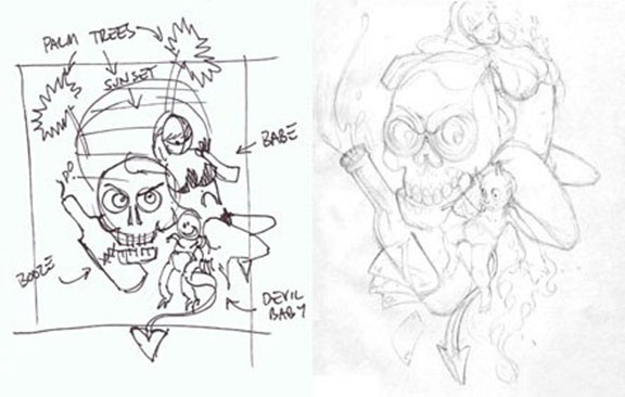在由草圖到矢量圖一文中,GoMedia的比爾說他們盡可能早的去獲得客戶的認可。在畫出更精確的草圖前,他們將一系列粗略的草圖拿給客戶。左下圖是客戶從中挑選出的草圖。在草圖經由電腦制作之前,先畫出如右下圖一般更具體的草圖。