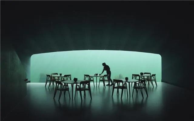 在挪威南部的林德斯內斯,Under餐廳將當地的海洋生態系統呈現在人們眼前,使顧客得以體驗到神秘而奇妙的水下世界。它看上去就像是要滑入大海中,建筑師的原意是要融入其環境,混凝土外殼則像是海邊凸起的礁石。因為主要用餐區位于海底,為了確保良好的能見度,使用了微弱的室內燈光來營造漸變效果,一方面吸引海洋生物游到落地窗前,另一方面也讓深色海水更加突顯。