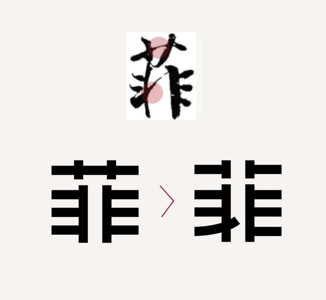 參考行書,“菲“字的草字頭中間可以斷開,斷開后,字體兩邊恰好對稱,我們還是參考行書,把左下角的橫筆做一個延長處理。這樣,就會變得很有個性,同時也不會降低辨識度。
