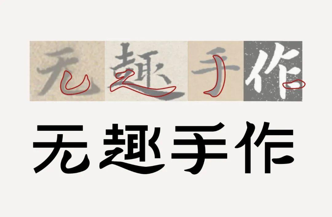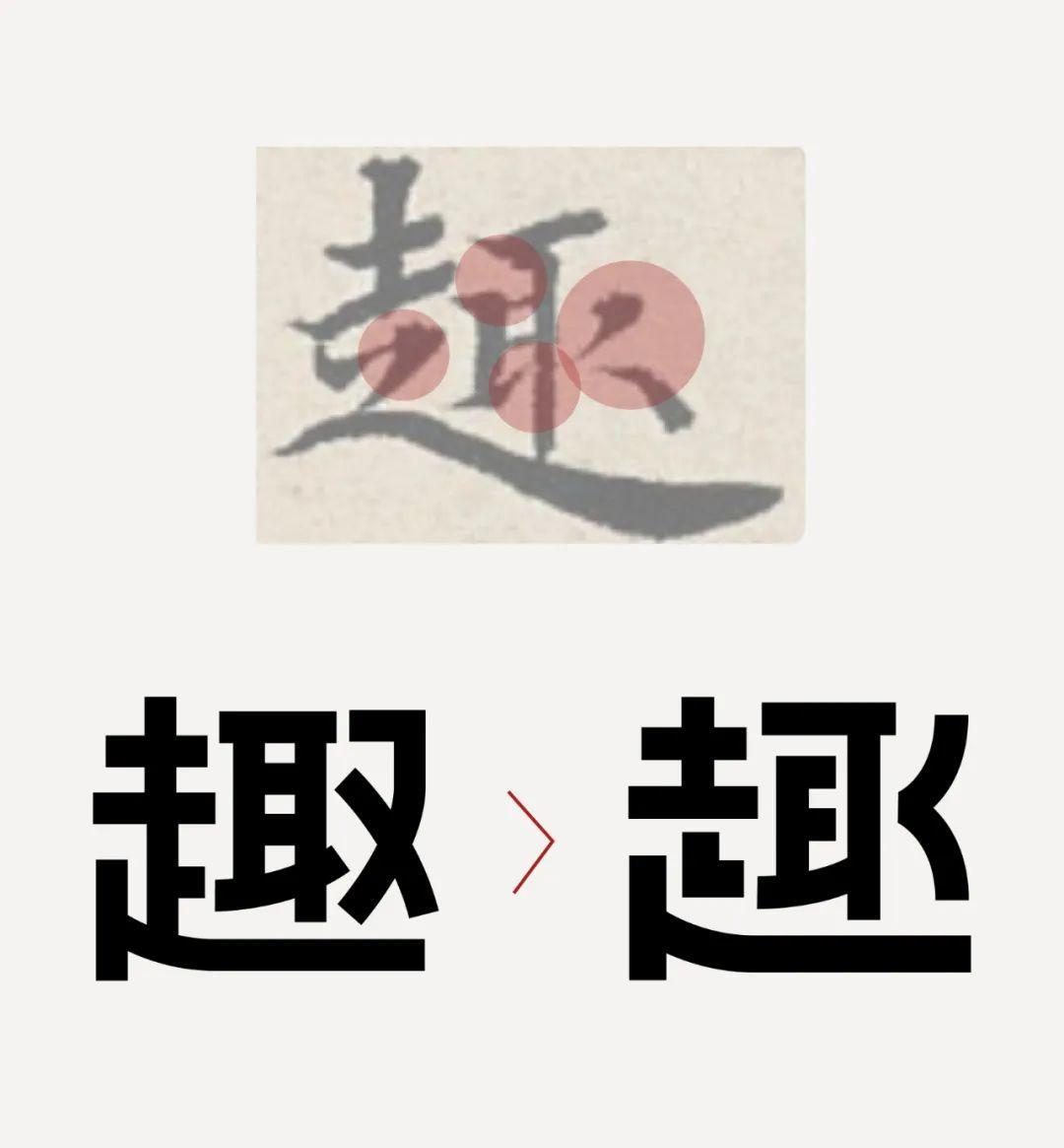 后面。可以用同樣的方法,繼續給字體做減法,觀察行書的結構,會發現“趣”的左下角有斷連,可以簡化。