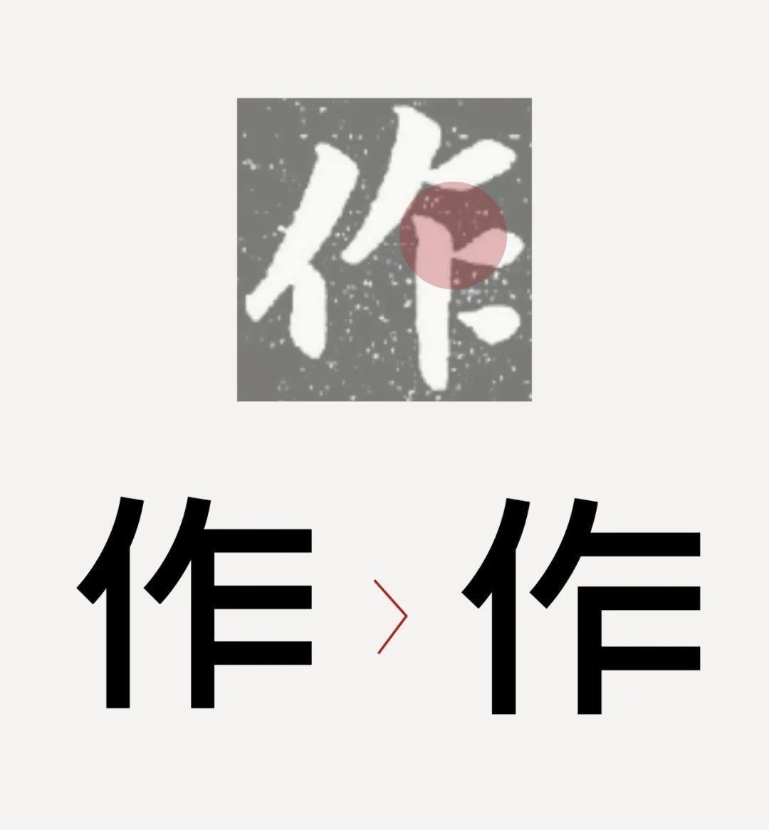 觀察“作”字,會發現其右上角有三個筆畫交叉,顯得繁瑣,那到底斷哪個筆畫更合理呢,行書又給了我們答案,觀察行書,發現“作”字中間豎筆的起筆有斷開,斷開后,也順勢和右邊的橫筆連接起來,盡量避免出現短筆畫。
