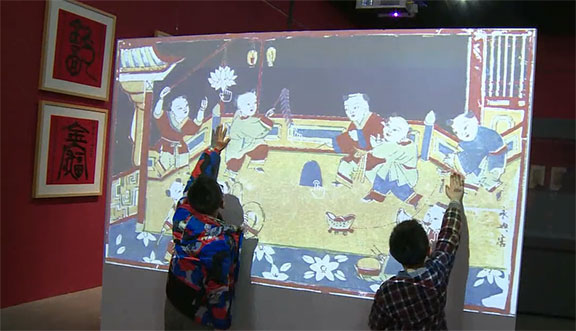 互動裝置藝術作品《大過年》在創作時對原畫進行了數字化重構,加入聲音視覺可視化效果,并結合互動體感交互技術,體驗者通過觸摸裝置上的觸摸感應器,觸發電腦相關程序播放動畫,通過投影儀將動態光效投射到靜態裝置作品上,使體驗者與年畫人物進行交互。數字媒體技術的展示讓年畫更加“活”起來,通過體驗者與作品的互動體驗,讓觀者在娛樂中加深對木版年畫這種傳統藝術形式的認知,喚起人們對年畫的熱愛,從而促使人們對中華優秀傳統文化的熱愛。