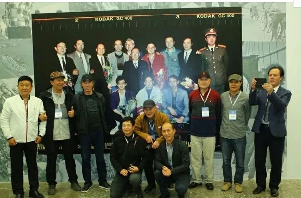 到場的9位首屆全國十大青年攝影家錢捍、劉占坤、邱曉明、王建軍、郭建設、梁達明、王文揚、姜振慶、李前光(按照從左至右的順序)在當年頒獎后拍攝的照片前合影留念。 王魯生 攝