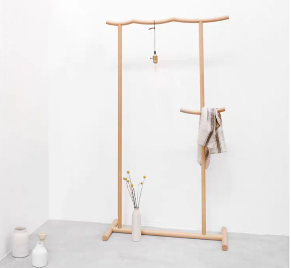 江南衣架的頂部主梁使用整根木材打磨完成,而非拼接而來,因此結構非常結實。自然下落的垂直骨架,高度適中,足夠掛放多款不同尺寸的衣物,屋檐的兩端,還可隨意掛搭衣物、圍巾、帽與包,也讓掛放衣物這樣簡單的小事,成為更加舒適省心的過程。三個不同弧度的掛桿,更具流線設計感。在掛衣服時,可隨著江南曲線自然區分各人的“專屬空間”。