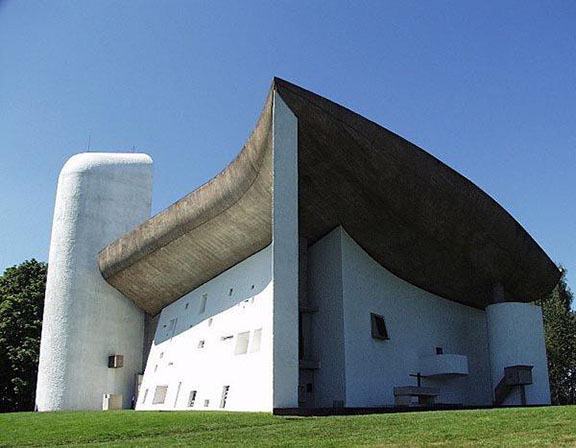 朗香教堂是勒·柯布西耶建筑風格轉換的一個代表作品,朗香教堂的設計脫離了早期建筑上的理性主義的設計原則其外形上充滿了神秘及其隱喻的內涵,從不同角度看去,教堂外形或像一只祈禱的手或像一艘船或像兩位修女……這極為抽象的造型也體現了作者的想象力。