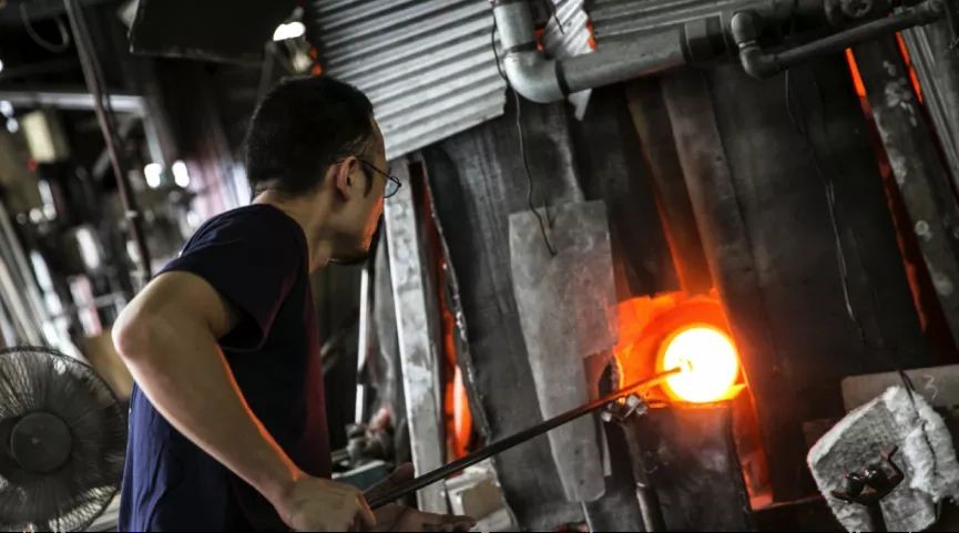 除此外,也有金屬、木制或石膏的模具,將熔化的原料在模具中吹制,待冷卻后即可形成固有的形狀造型。一只硝子的誕生,都是經過燒制、熔化、吹制、切割、打磨等種種繁復的工藝程序,想要得到一只剔透瑩潤、細膩平實的硝子,這著實是在考驗玻璃匠人的手工藝水平。