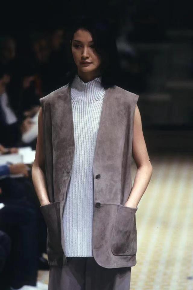 但現(xiàn)實與理想的差距似乎誰也逃不過,品牌的時尚表現(xiàn)出色但商業(yè)表現(xiàn)欠缺,1997年面對愛馬仕的邀約,margiela欣然接受地?fù)?dān)任了愛馬仕女裝線的創(chuàng)意總監(jiān),一共擔(dān)任了6年,在他任職期間,面對大眾的質(zhì)疑他推出的一系列作品打出了一手好牌,讓人連連叫好。比如98年AW系列中經(jīng)典的“Vareuse”大深v直開到腰間,性感但又十分休閑舒適,實穿性極強。柔軟的皮革外套長及腳踝,沒有花紋與配色,只有色調(diào),優(yōu)雅至極,與愛馬仕品牌調(diào)性十分貼合,奠基了奢侈品是何為貴氣,直到今天大家所說的“高級感”一詞多多少少有他的功勞。哪怕在十多年之后margiela時期的愛馬仕依舊在二手中古市場備受粉絲喜愛收藏。