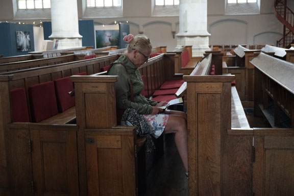 圖7.一位游客坐在長椅上看老教堂的宣傳冊
