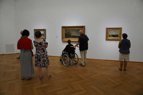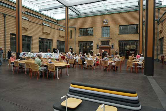 在荷蘭,博物館是人們日常生活必需的場所。當然,荷蘭的博物館對荷蘭人是免費開放的。在考察過程中,我看到很多殘疾人坐著輪椅來參觀(圖5)。他們內心飽滿,不卑不亢,沒有絲毫自卑感,認真地觀看每一幅作品,并和家人交流觀看的心得。另外,還經常看到一家人集體出動,去參觀某個博物館(圖6.)。對一些稍微有些淫穢色情的內容,家長也不避諱。至于孩子能不能理解畫面的內容,家長似乎也并不關心。參觀累了,博物館已經準備好了食物和飲料,有專門供游客坐下來補充能量的場所(圖7.)。游客也可以自帶食物。有的當地人就自己帶著幾片面包,坐在那里,幾分鐘吃完,就算是一頓飯了。對于有一顆非常挑剔的中國胃的我來講,看到他們如此簡單地來敷衍午餐,簡直不可理喻。感慨還是中華美食甲天下